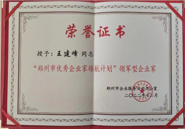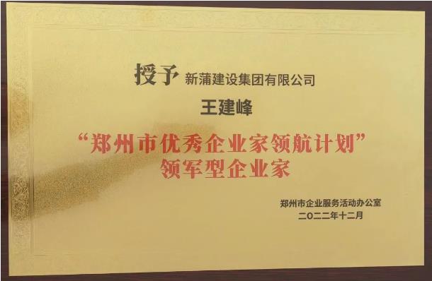 新蒲建設(shè)集團董事長王建峰喜獲“鄭州市優(yōu)秀企業(yè)家領(lǐng)航計劃·領(lǐng)軍型企業(yè)家”榮譽稱號