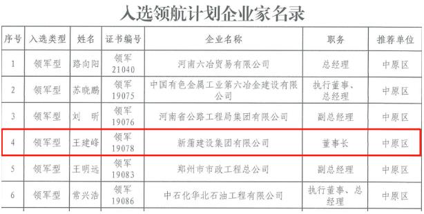 為進一步加強我市優(yōu)秀企業(yè)家隊伍建設(shè),充分發(fā)揮企業(yè)家在產(chǎn)業(yè)轉(zhuǎn)型升級、創(chuàng)新創(chuàng)業(yè)中的組織管理和引領(lǐng)帶動作用,由鄭州市企業(yè)服務(wù)活動辦公室舉辦的“鄭州市優(yōu)秀企業(yè)家領(lǐng)航計劃”活動,近日發(fā)布了入選名錄。新蒲建設(shè)集團董事長王建峰喜獲“鄭州市優(yōu)秀企業(yè)家領(lǐng)航計劃·領(lǐng)軍型企業(yè)家”榮譽稱號。